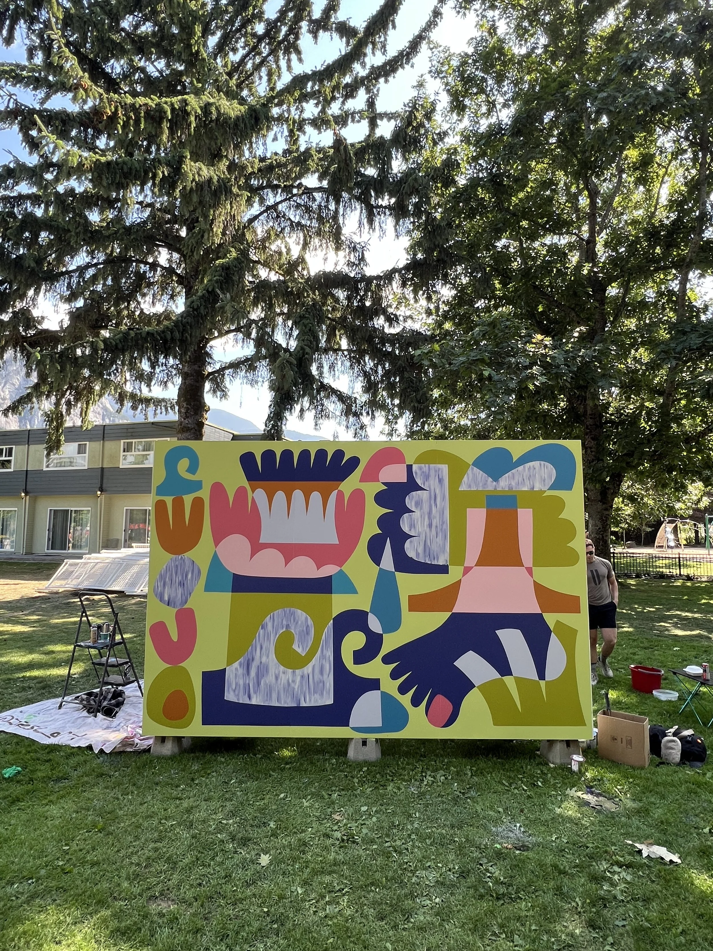 Hand cut and painted plywood installation pieces for an outdoor music festival, market, and arts event in Squamish BC in August of 2023